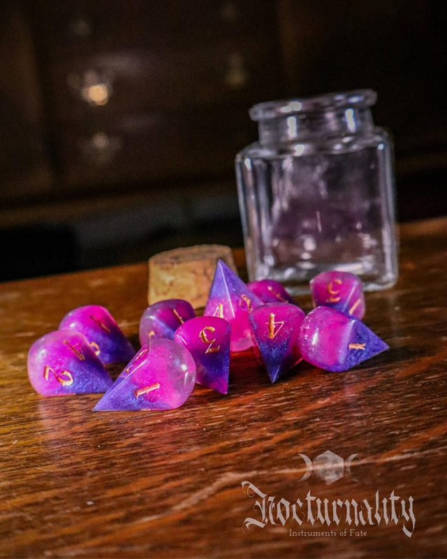 This potion bottle is filled with mesmerizing D4 dice that feature violet and fuchsia colouring. They're inked in gold.