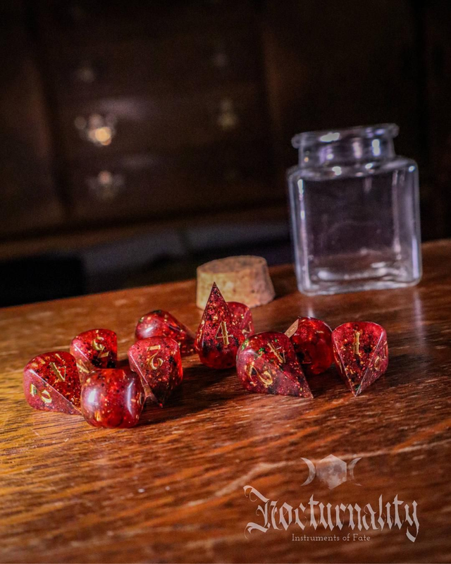 This potion bottle is filled with mesmerizing D4 dice that are red with flecks of metallic green and gold. They're inked in gold.